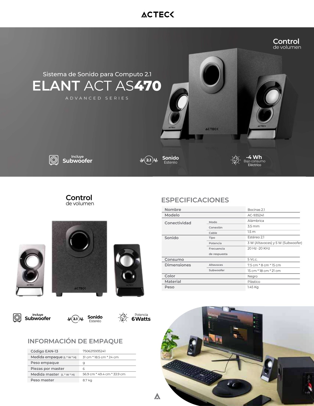 La bocina con subwoofer Acteck Elant ACT AS470 es un dispositivo alámbrico que ofrece una potencia estimada RMS de 6 W y una potencia RMS para el subwoofer de 5 W. Diseñado para ser ubicado en mesas o estantes, este sistema se recomienda especialmente para su uso en hogares.